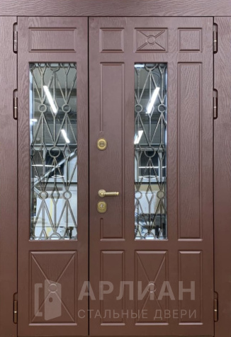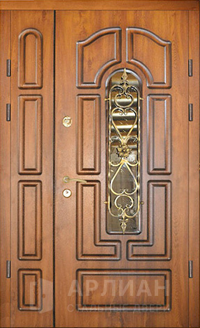 Входная двустворчатая дверь со стеклом и ковкой в загородный дом №14