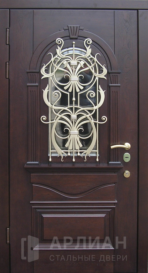 Высокая арочная дверь с фрамугой и кованой решеткой №12